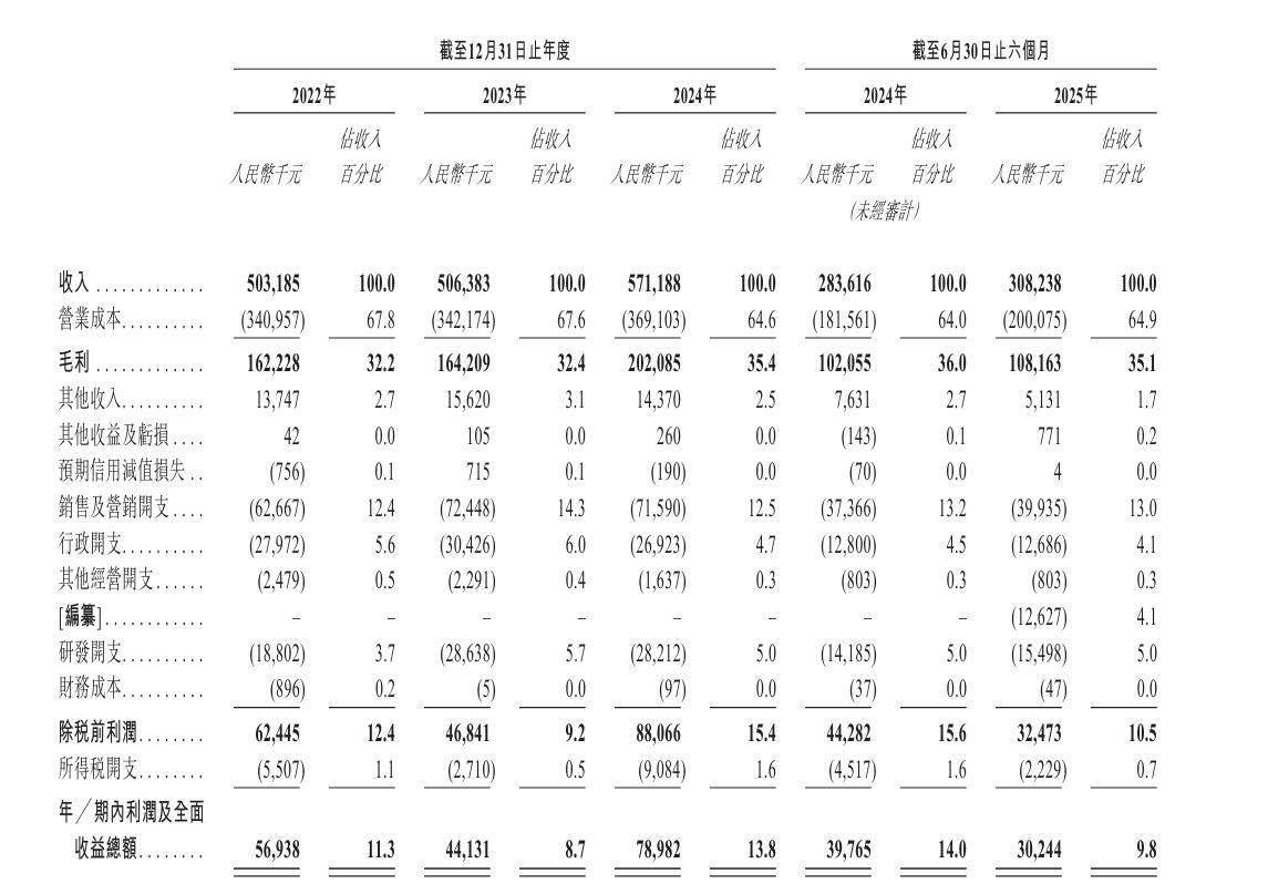 财务方面,在2022年、2023年、2024年以及今年上半年,铜师傅的收入分别为5.03亿元、5.06亿元、5.71亿元及3.08亿元。同期的毛利率分别为32.2%、32.4%、35.4%及35.1%。同期,公司的净利润分别为5693.8万元、4413.1万元、7898.2万元及3024.4万元。