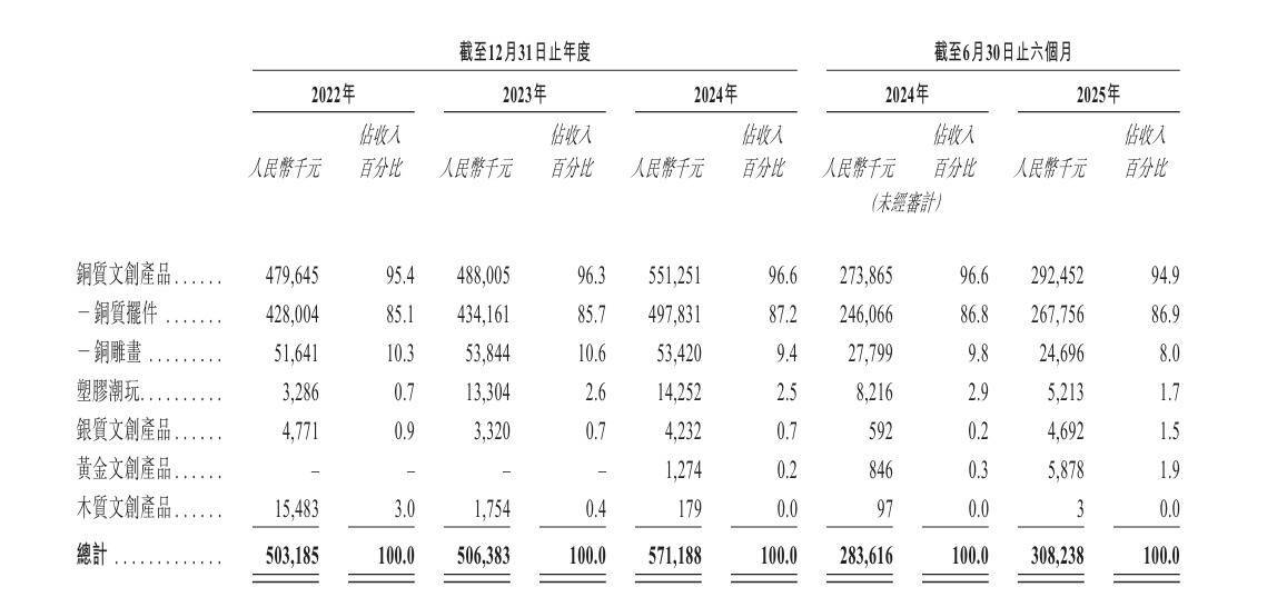 目前,铜质文创产品仍是铜师傅的绝对主营业务。在2022年、2023年、2024年以及今年上半年,铜质文创产品的收入分别为4.80亿元、4.88亿元、5.51亿元、2.92亿元,分别占同期总收入的95.4%、96.3%、96.6%及94.9%。尽管公司已尝试拓展塑胶潮玩、银质及黄金文创等多元品类,但进展相对缓慢。